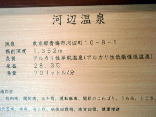 | 河辺温泉 梅の湯 (アルカリ性単純泉) 最近できた温泉です。駅前という最高の立地に立ってます。5階の展望のいい場所に設けられており、 御飯を食べながら奥多摩の景色を楽しむ事ができます。湯はこの地域に多い、灰色の湯ですが、源泉掛け流しと銘の打たれた露天の掛け流しの浴槽は灰色の湯の花おぼしきものが湯の中を舞っており、とても成分の 濃さを感じさせます。湯は皮膚をしっかりコーティングされるところがとてもPOINTが高いです。 お湯は無味無臭です。 交通 JR青梅線 河部駅より徒歩1分 青梅市河辺町10−8−1 河辺タウンビルB 5.6階 0428−20−1026 840円 10時から23時30分まで 無休